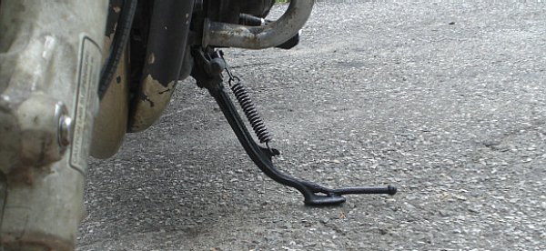Modifying the front wheel in this way comes at a small cost of convenience. With the 1" shorter front wheel, the geometry of the motorcycle shifts slightly and may cause kickstand issues. In John's case, he also lowered the rear of the bike by installing significantly shorter shocks. The combined effect of the lowered rear and front ends made it absolutely impossible for a single individual to raise the motorcycle onto the centre stand - that became a two-man job and even then it wasn't easy. The shorter overall height also meant that John's side stand became too long for the new geometry. The bike wasn't able to lean to one side - it stayed essentially vertical - so John had to shorten the side stand by heating it with a torch and bending it as pictured below.