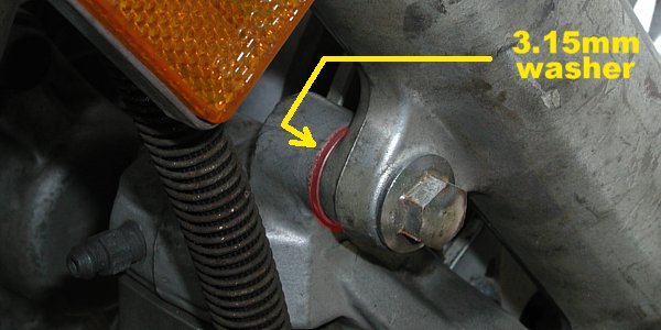 When attempting to remount the Maxim-X brake calipers, you'll soon realize that they don't align properly with the Fazer brake rotors. According to John, the Maxim-X brake rotors are 6.30mm more separated than those of the Fazer making modification necessary. To accommodate the difference, the calipers must be offset by inserting two 3.15mm thick washers between each caliper and its respective fork which will shift the calipers closer to the centreline of the wheel and bring them into proper alignment with the Fazer brake rotor offset.