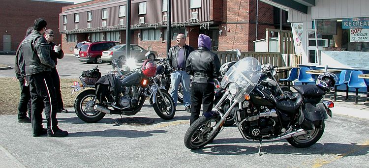 Here's a shot that was taken at the meeting point just before a few of us XJers got together for a ride along the renowned Forks of the Credit Road back in March 2006. That's Omar "Crash" Petralis at the left and Brock Smith just to his right. I think that's Baz who's completely obscured between them. The guy in the centre, of course, is Mike "Superman" Kampman. And, of course, the covert individual in the purple hood is SWMBO, cleverly concealing her face from the camera. What's new. | |