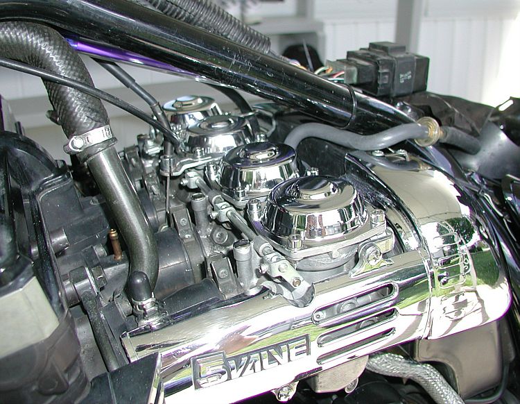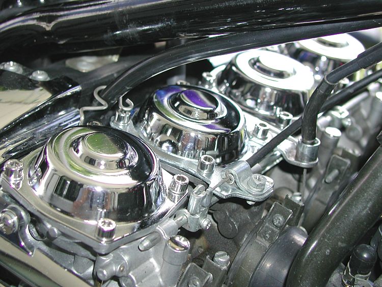 These pictures of my bright & shiny Mikunis were taken to commemorate the addition of polished socket head cap screws and chrome pilot screw caps. Polishing the stainless steel screws to a shine took a fair amount of time but was well worth the effort. | |