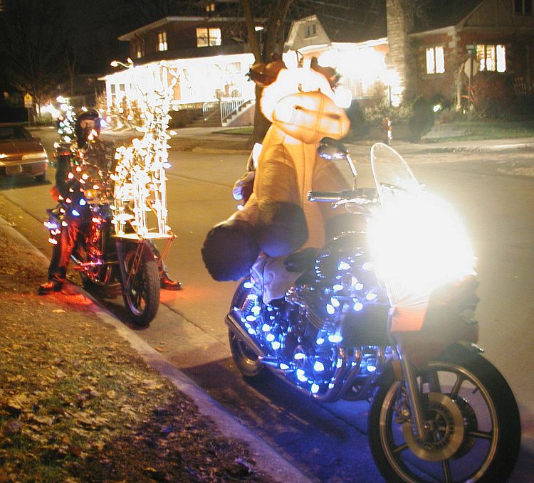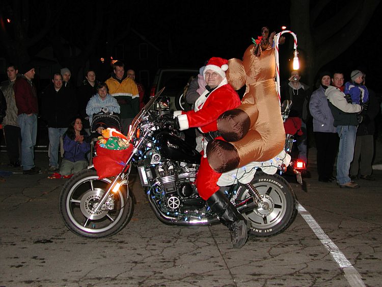 Back in November 2004, the Hamilton chapter of the Southern Cruisers organized participation in the Waterdown Santa Claus Parade (what I like to call the Santa Claus "Charade"). I dressed up as a beardless Santa and chauffeured a 5ft inflatable Rudolph in a group of eight or so participating motorcycles. I hooked up my X-Power invertor to power a fan to inflate Rudolph, a light to illuminate Rudolph, a candy cane lantern and a string of LED lights that went all around the bike. In the pictures you'll also see my father-in-law on his decorated V30 Magna. What can I say... he likes to go overboard. The whole thing was excrutiating. We waited at our staging area for about 3 hours in the cold before merging into our place in the parade. Then we spent about 2 hours traversing a mere 2km loop, brutalizing our clutches the whole way. By the end of the parade, my battery was mighty low from idling for such a long time with the extra electrical load, and I could tell my clutch wasn't too happy either (a feeling shared by the others). I won't be doing that again. Bah humbug! | |