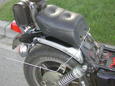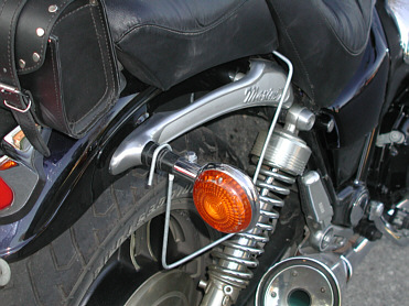 Despite the adjustments, this saddlebag retainer bar design worked out very well. From the different perspectives of the pictures below, it should be clear how the retainer bar hooks over the flasher posts and how the saddlebags are supported when it's all in place. There's also plenty of clearance at all points so that the retainer bar doesn't come into contact with any sensitive surfaces: